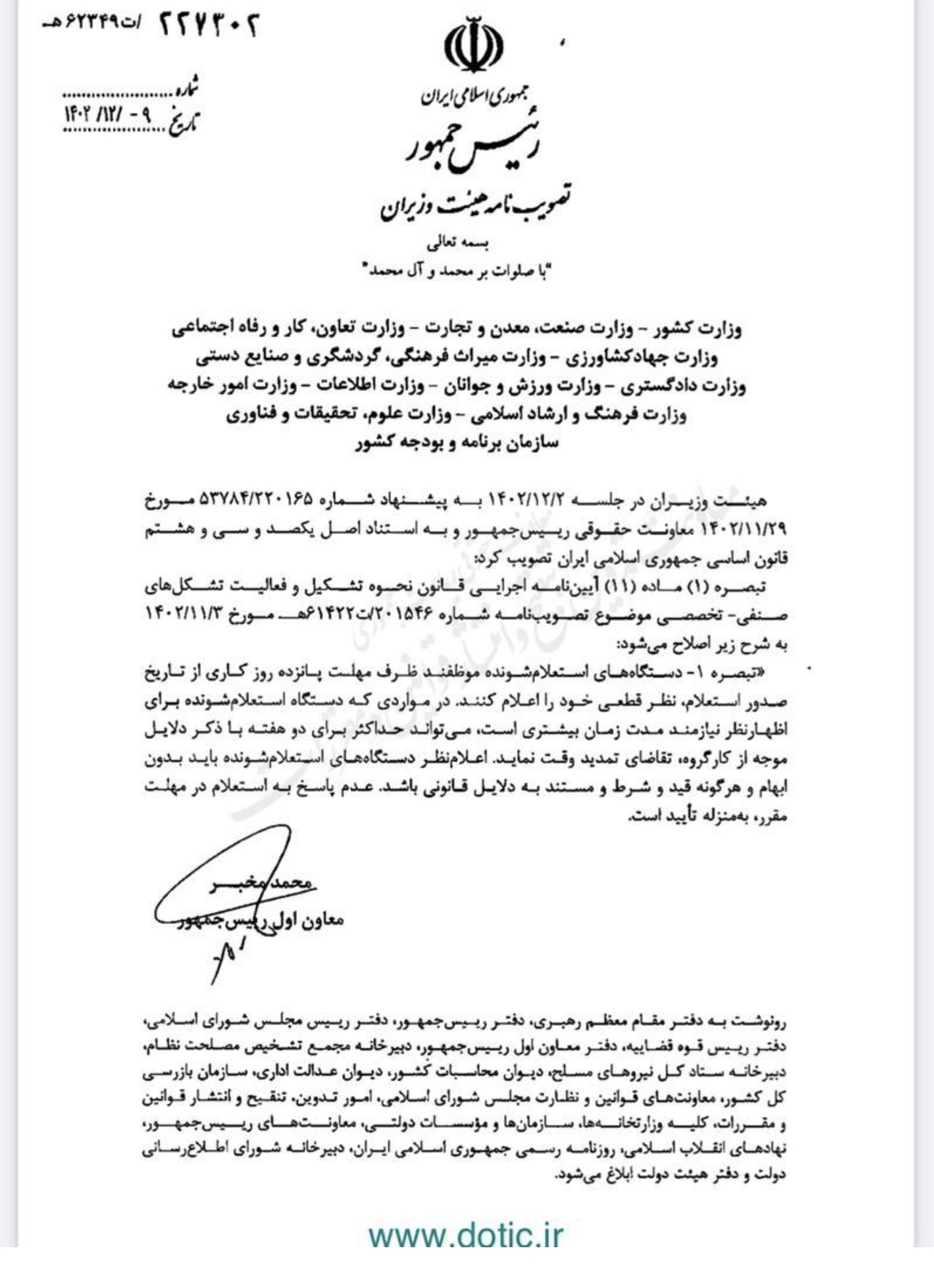 به گزارش بازار قیر هیات وزیران در جلسه مورخ 1402/12/02 مصوب کرد دستگاههای استعلام شونده موظفند ظرف مهلت پانزده روز کاری از تاریخ صدور استعلام، نظر قطعی خود را اعلام نمایند و عدم پاسخ به استعلام در مهلت مقرر ، به منزله تایید است.